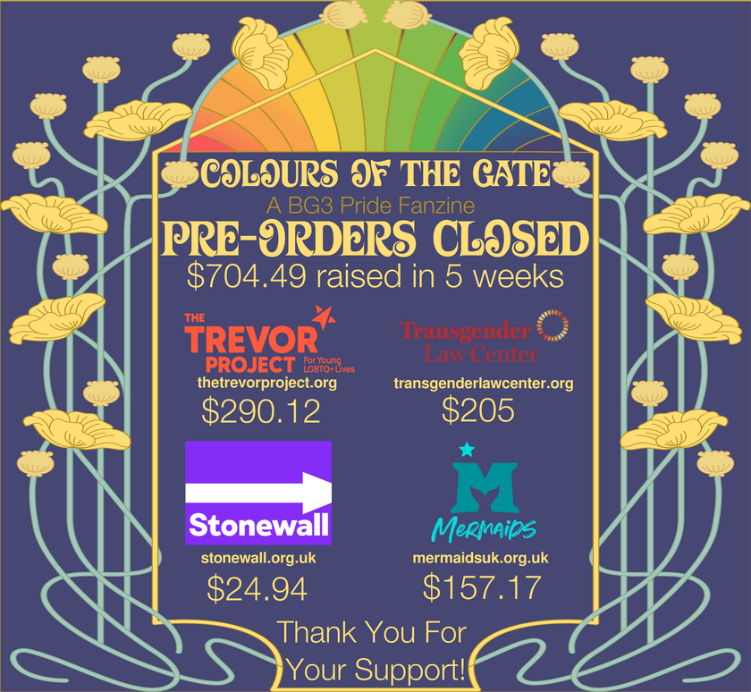 Colours of the Gate is a Baldur’s Gate 3 charity fanzine dedicated to showcasing and celebrating the diverse queer identities in the game we love and in our community. Contributors and characters of all queer identities are welcome; we aim to produce a zine that is as diverse as the community making it. In particular, we want people of color, sapphic, trans, and gender diverse folks to know they are not only welcome on this project but encouraged to apply. Both canon and tav/durge ships are welcome, as are solo and platonic works.This project will be raising funds for four LGBTQ+ charities:- The Trevor Project